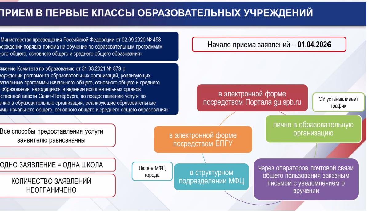 Подача заявлений будет доступна на Портале госуслуг Санкт-Петербурга gu.spb.ru в полночь 1 апреля, в любом МФЦ города, в электронной форме посредством ЕПГУ (gosuslugi.ru), лично в ОУ (каждый вторник с 15:00 - 18:00), через операторов почтовой связи (заказным письмом с уведомлением)
